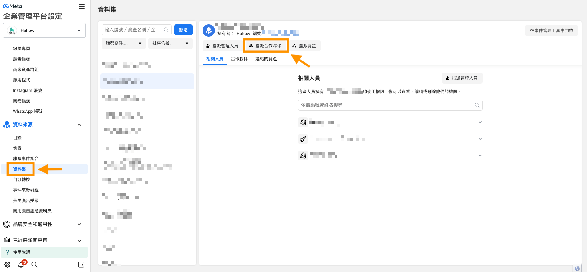 * 進入[企業管理平台設定](https://business.facebook.com/settings)後，在畫面左側的「資料來源」中選擇「資料集」，並選擇要分享的像素，然後點擊「指派合作夥伴」。